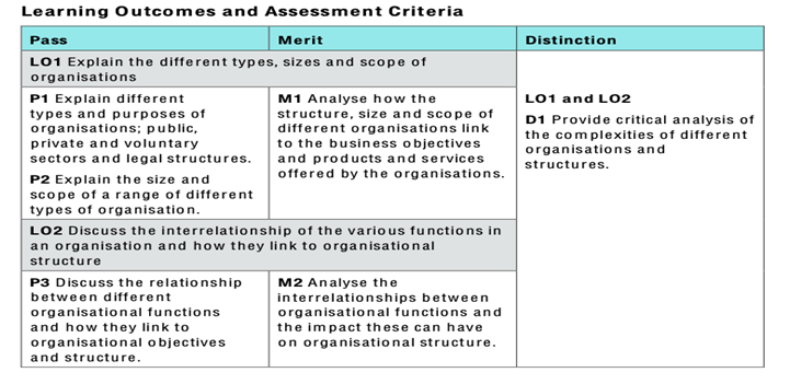 LO1 Explain the different types, sizes and scope of organisations LO2 Discuss the interrelationship of the various functions in an organisation and how they link to organisational structure LO3 Use contemporary examples to demonstrate both the positive and negative influence/impact the macroenvironment has on business operations LO4 Determine the internal strengths and weaknesses of a specific business and their interrelationship with external macro factors | |